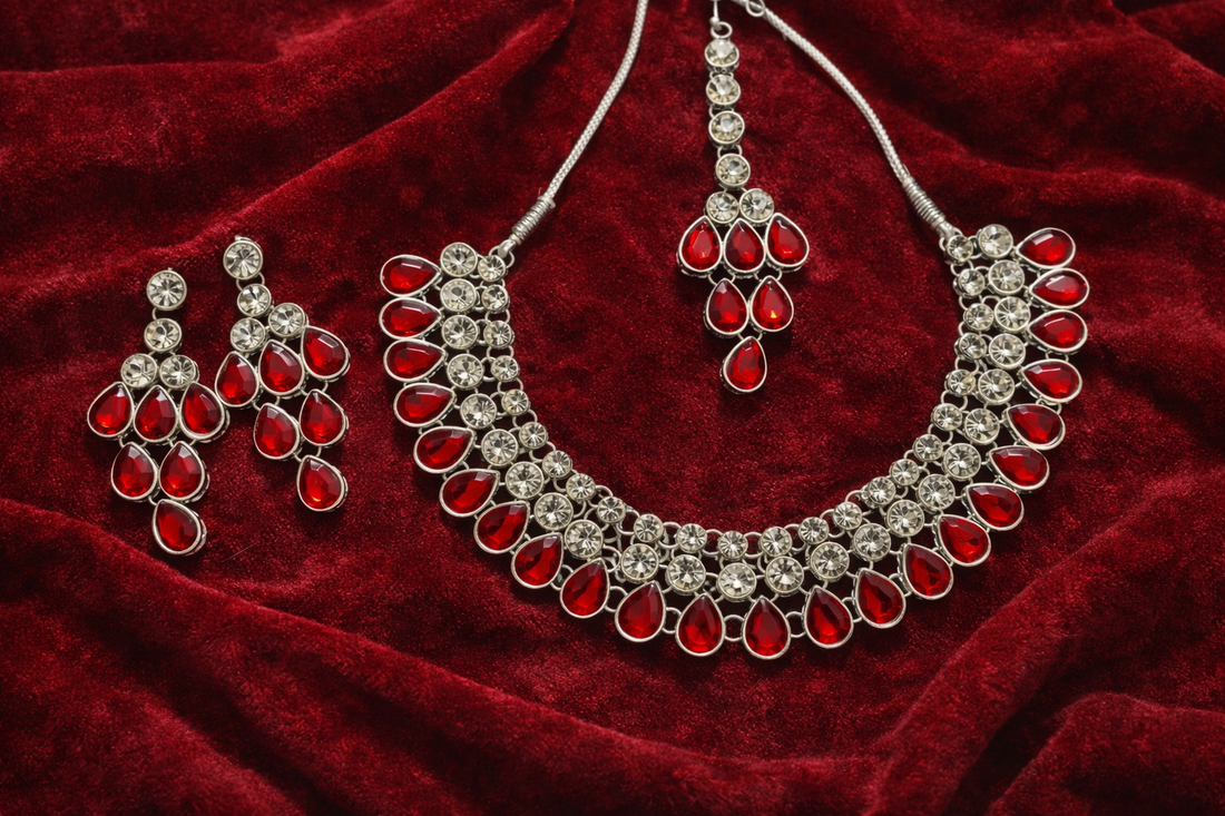 Ikarave Silver Plated Ruby Red Crystal Jewelry Set with Matching Earrings and Maang Tikka for Women, Designer Party Wear Bridal Wedding Fashion Accessories for Festive and Special Occasions