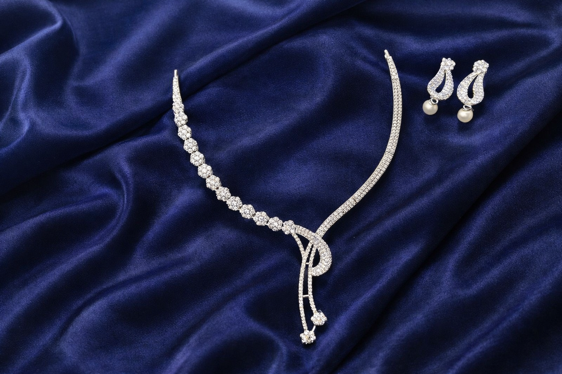 Ikarave Silver Plated Crystal Swan Design Necklace Set with Pearl Drop Earrings, Elegant Party Wear Bridal Jewelry for Women and Girls, Wedding Festive Fashion Accessories Gift Set