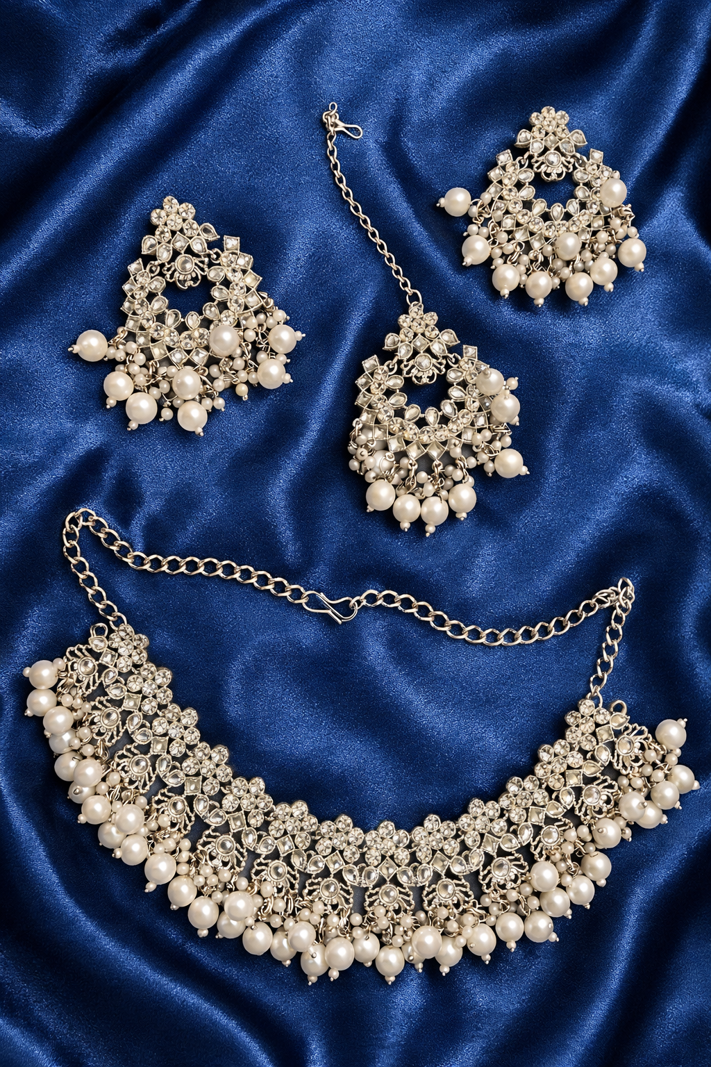 Ikarave Silver Plated Pearl Neckpiece Set with Matching Earrings and Maang Tikka for Women, Bridal Traditional Wedding Party Wear Ethnic Designer Jewelry Set