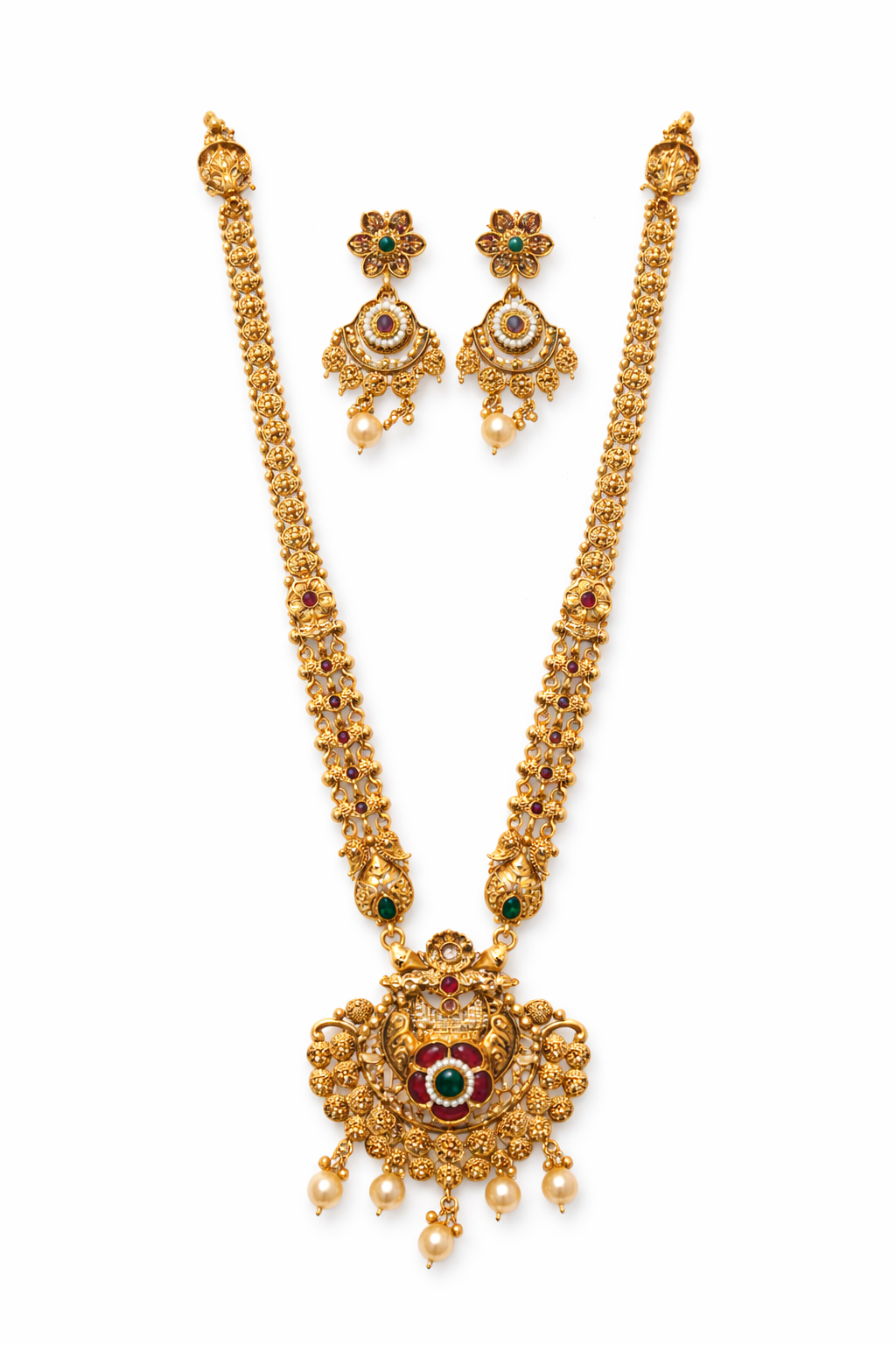 Ikarave Gold Plated Temple Jewelry Set with Long Traditional Pendant Design and Matching Earrings for Women, Bridal Wedding Party Wear Ethnic Fashion Accessories for Festive and Special Occasions