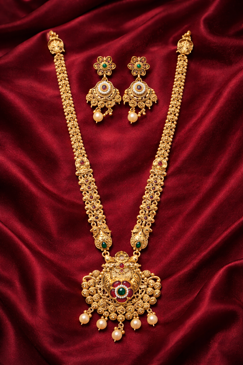 | The Ikarave Gold Plated Temple Jewelry Set is a magnificent representation of Indian tradition, culture, and fine craftsmanship. Designed with a long traditional necklace and a beautifully detailed pendant, this jewelry set brings divine charm and royal elegance to your ethnic wardrobe. The antique temple style design reflects heritage artistry and enhances your overall look with sophistication and grace |