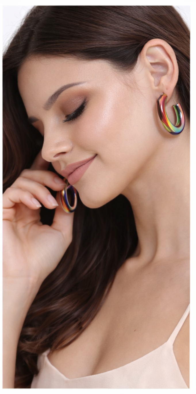| IKARAVE Iridescent Rainbow Hoop Earings are designed for women who love modern stylish and eye catching fashion jewelry. These earings feature a unique U shape hoop design with a glossy iridescent finish that reflects beautiful rainbow colors under different lighting making them a perfect statement accessory for trendy looks. The smooth surface and premium polish give these earings a luxurious appearance while maintaining a lightweight and comfortable feel for long hours of wear. |