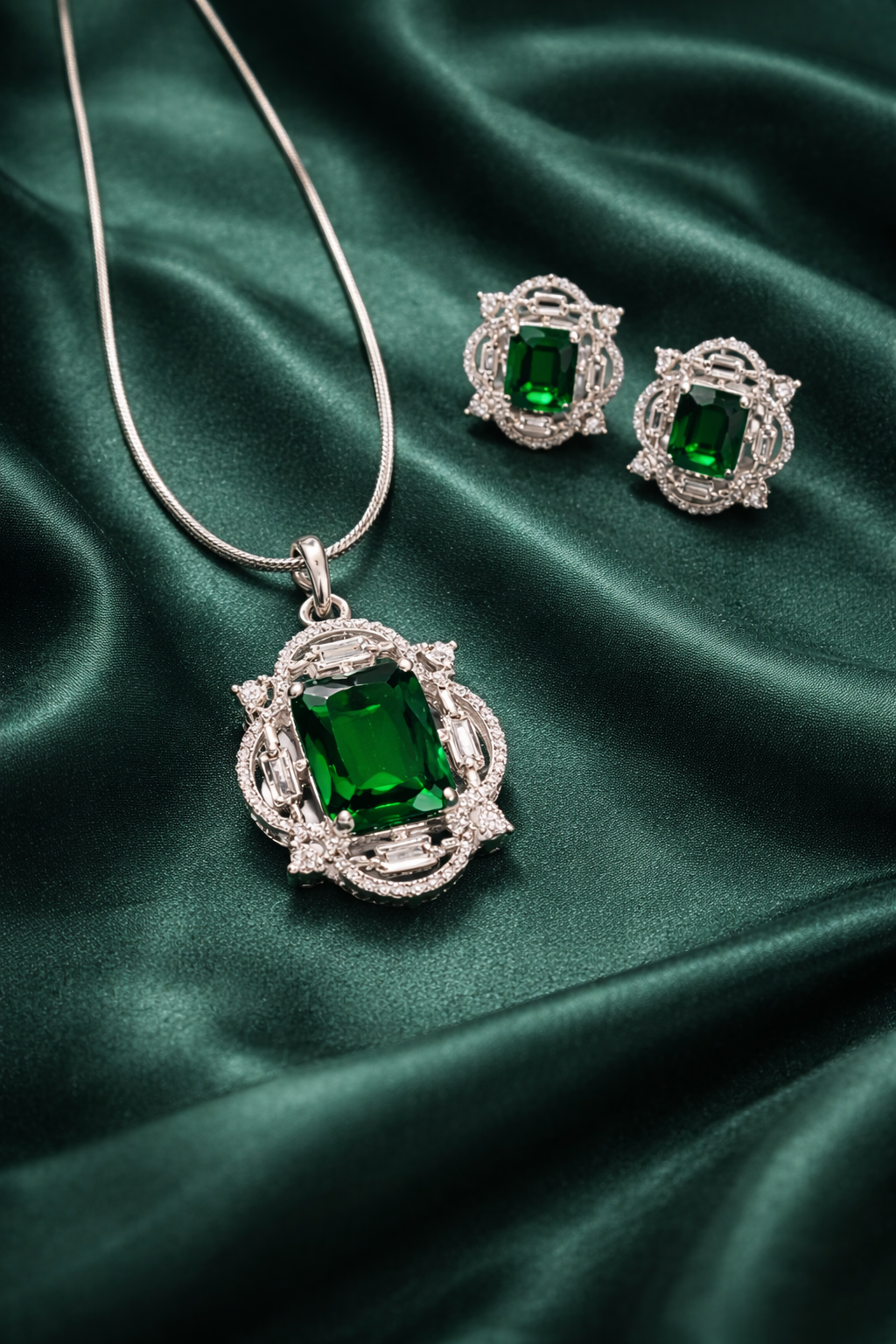 | Enhance your jewellery collection with the IKARAVE Royal Emerald Green Crystal Pendant Necklace with Stud Earrings Set, crafted to bring timeless elegance and modern charm together. This stunning set features a rich emerald green crystal stone, beautifully cut and surrounded by sparkling white stones that reflect light from every angle. The pendant design is bold yet balanced, making it perfect for women who love statement jewellery without being too heavy. |