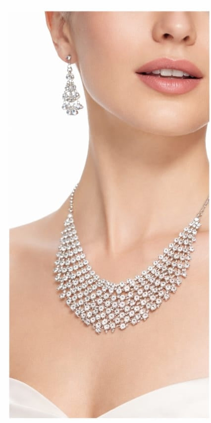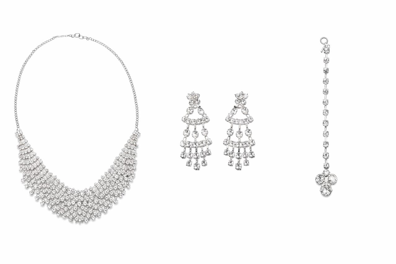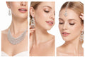 | The Ikarave Silver Plated Crystal Bridal Jewelry Set is a perfect blend of elegance, luxury, and traditional charm. This beautiful three piece set includes a stunning necklace, matching chandelier style earrings, and a graceful maang tikka that together create a complete and coordinated bridal look. Designed with sparkling crystal stones and a premium silver plated finish, this set reflects royal beauty and timeless sophistication. |